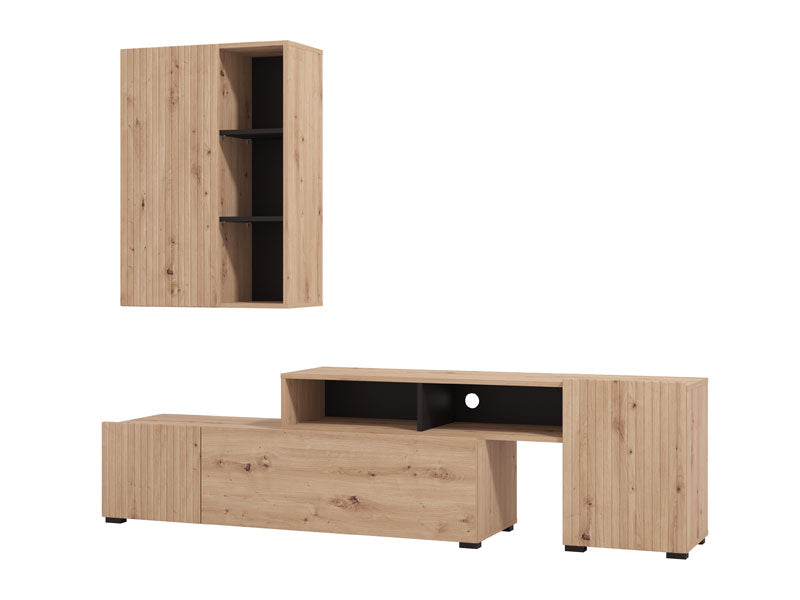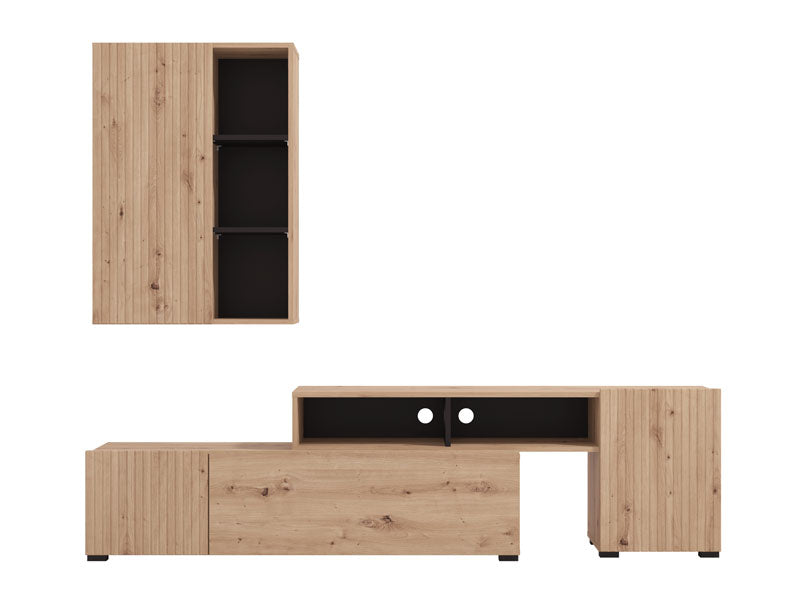 Холният комплект BALOS съчетава изчистени линии, модерна визия и умно съхранение в компактни размери. Антрацитният тон и естествените текстури внасят спокойствие и баланс в интериора, без да заемат излишно място – идеален за по-малки и тесни пространства.