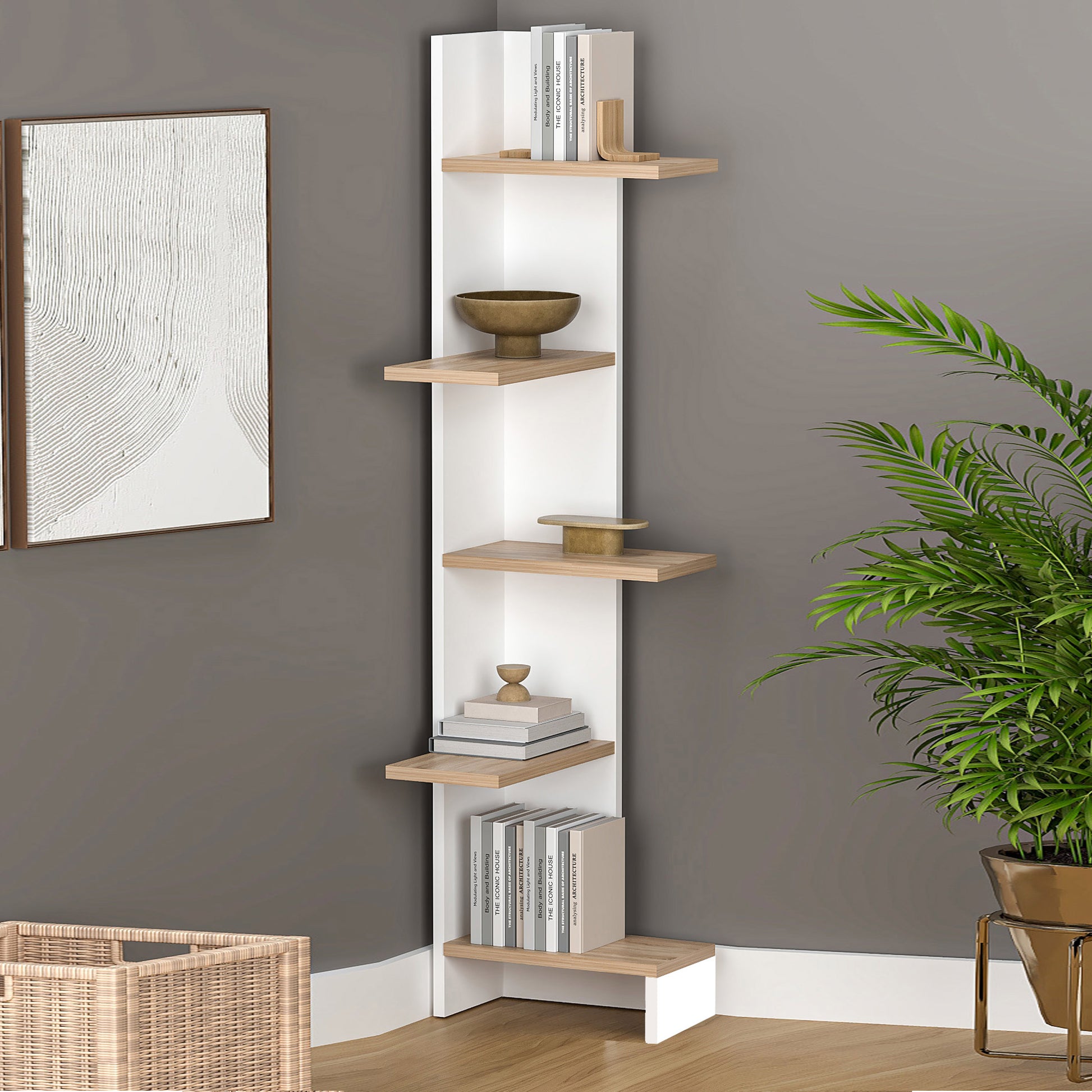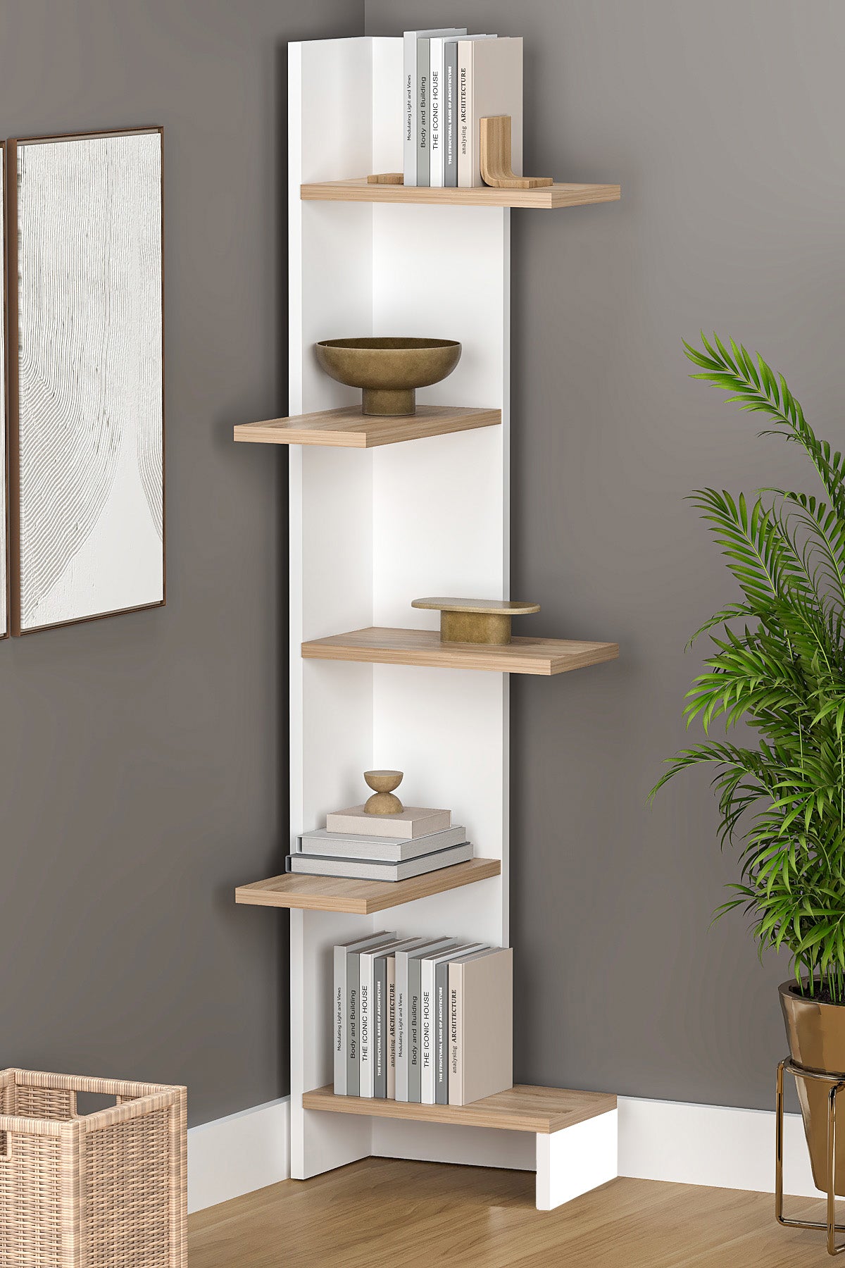 - Функционални рафтове: достатъчно място за книги, декорации, растения и офис принадлежности.