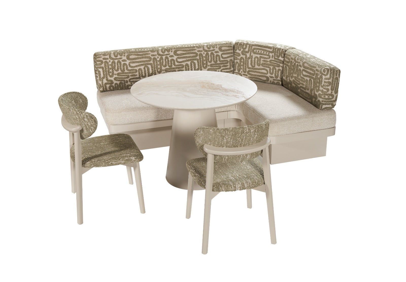 ORCHID е за домакинства с отношение към интериора, които обичат комфорта и отличителния дизайн. Подходящ за ежедневни семейни вечери и посрещане на гости. Бледите тонове внасят усещане за простор и светлина, а зеленикавите акценти придават характер и стил. Идеален избор за модерни кухни и трапезарии с изчистена естетика.
