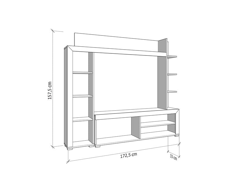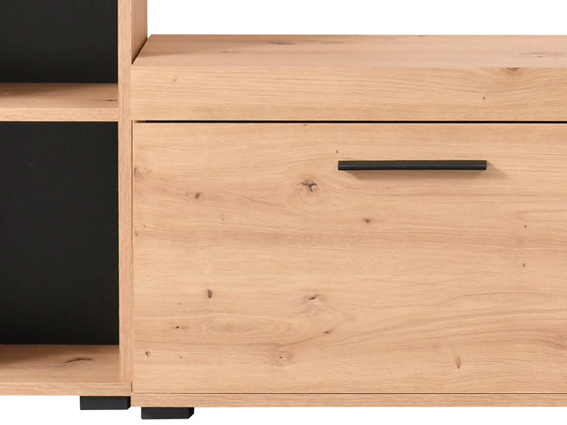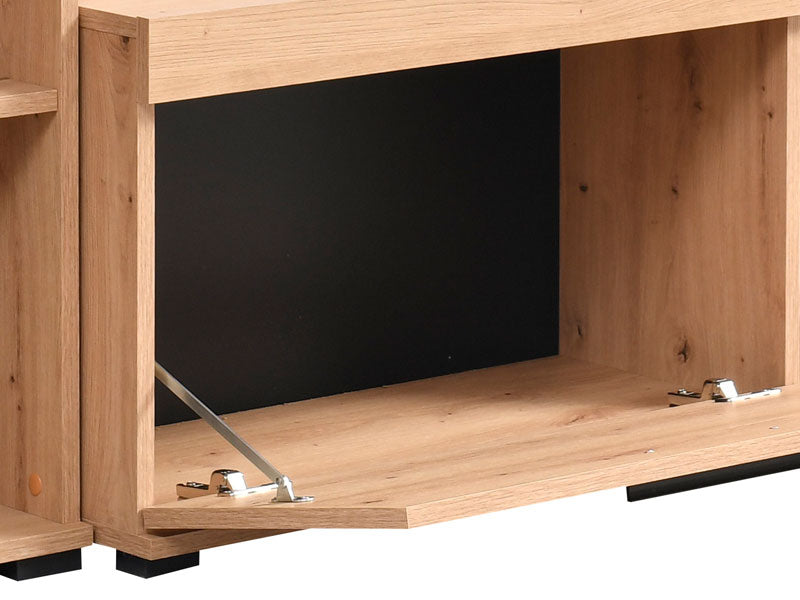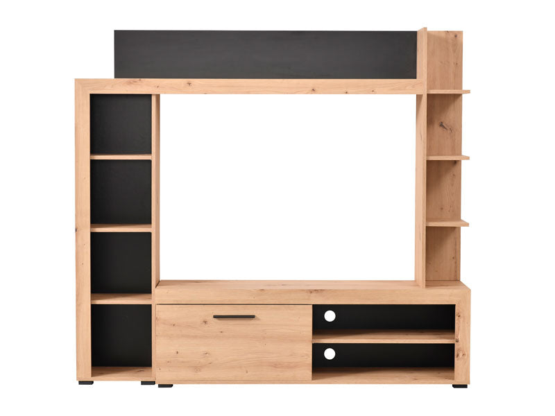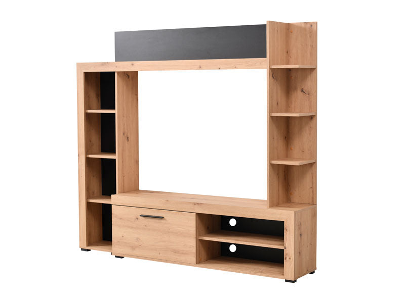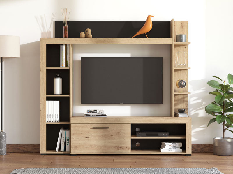RUBI е създаден за хора, които ценят подредбата, модерния дизайн и естествените дървесни тонове. Подходящ е за малки жилища, където оптимизацията на пространството е ключова. Използвайте основния модул за телевизор и техника, страничните рафтове – за книги и декорации, а долния шкаф – за вещите, които искате да останат дискретно подредени. Резултатът е уютна, модерна и хармонична холна зона.
