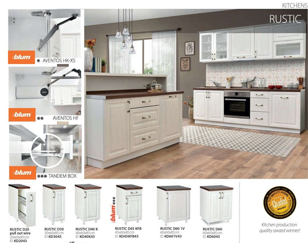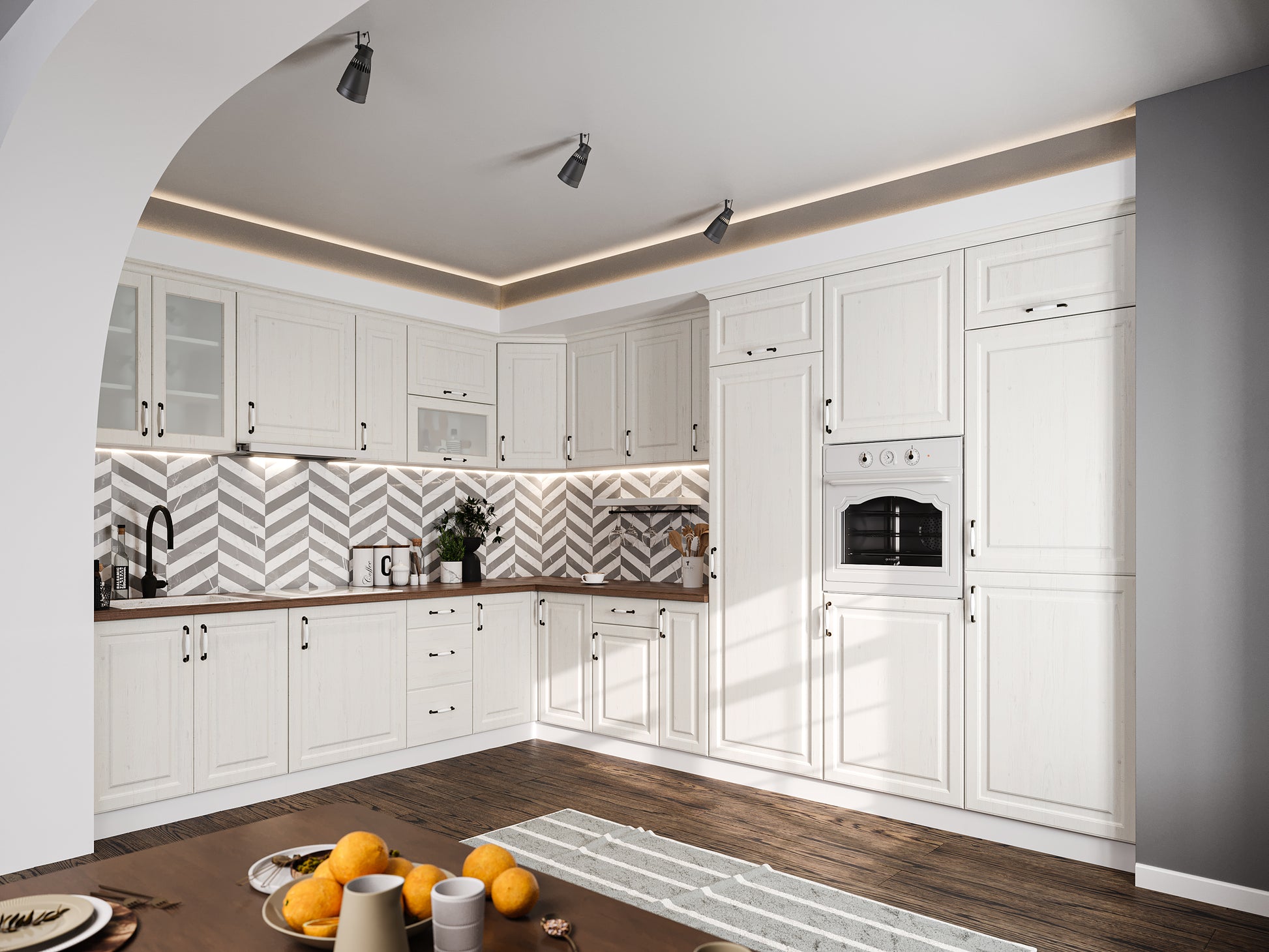 Rustik е за домакинства с отношение към уюта и отличителния, но изчистен дизайн. Подредете модулите спрямо вашето помещение и навиците ви в готвенето – от компактни градски кухни до просторни семейни зони. Белият финиш се съчетава с топли плотове и неутрални стени, за да превърне кухнята в светло и функционално сърце на дома.