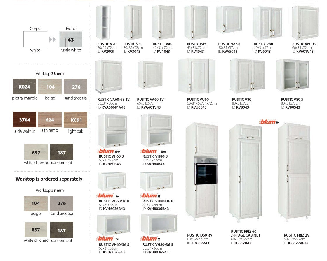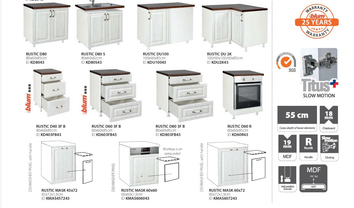 | Опции | Комбинации от горни/долни/високи шкафове, витрини, ъглови модули и чекмеджета. |