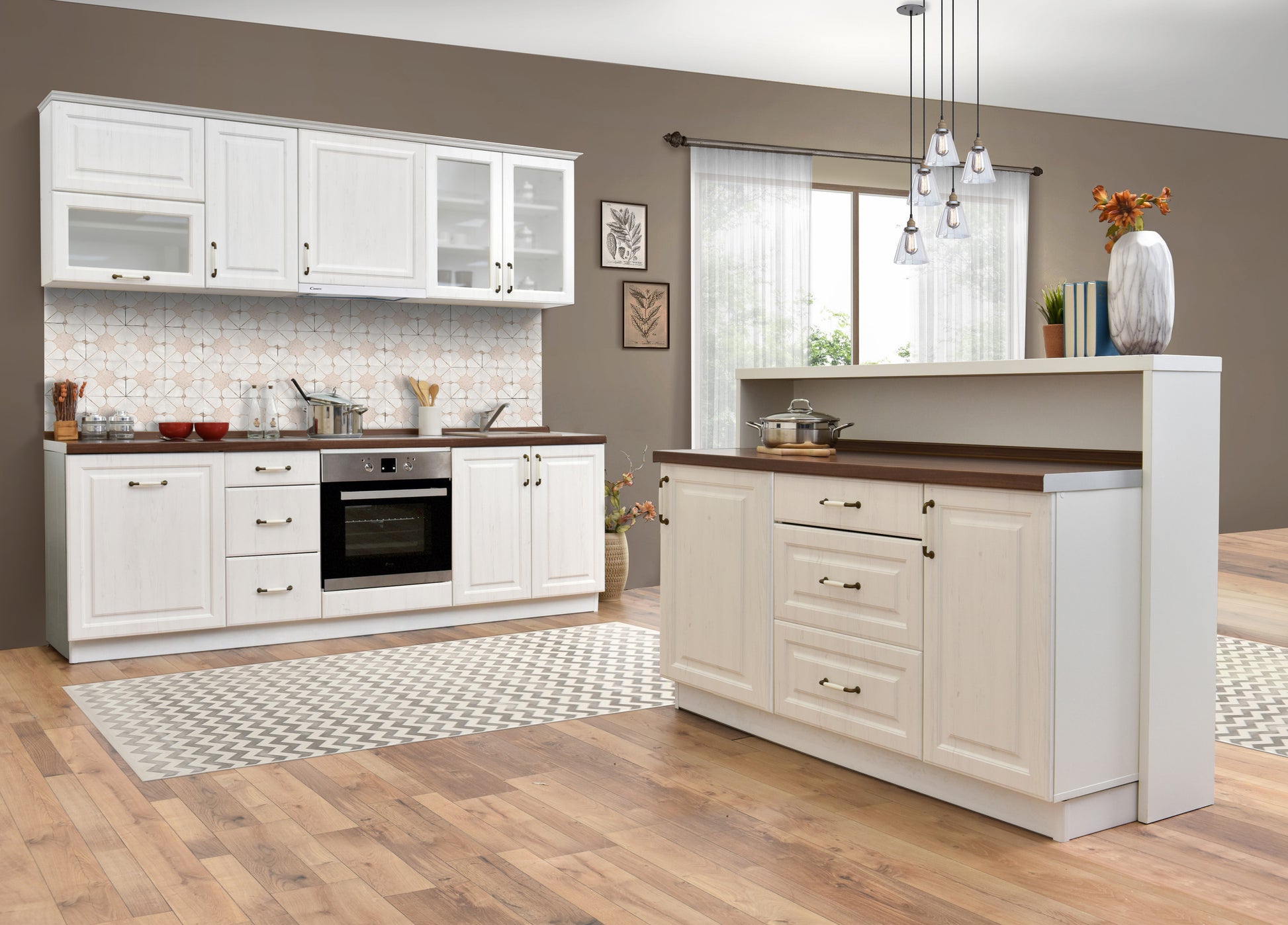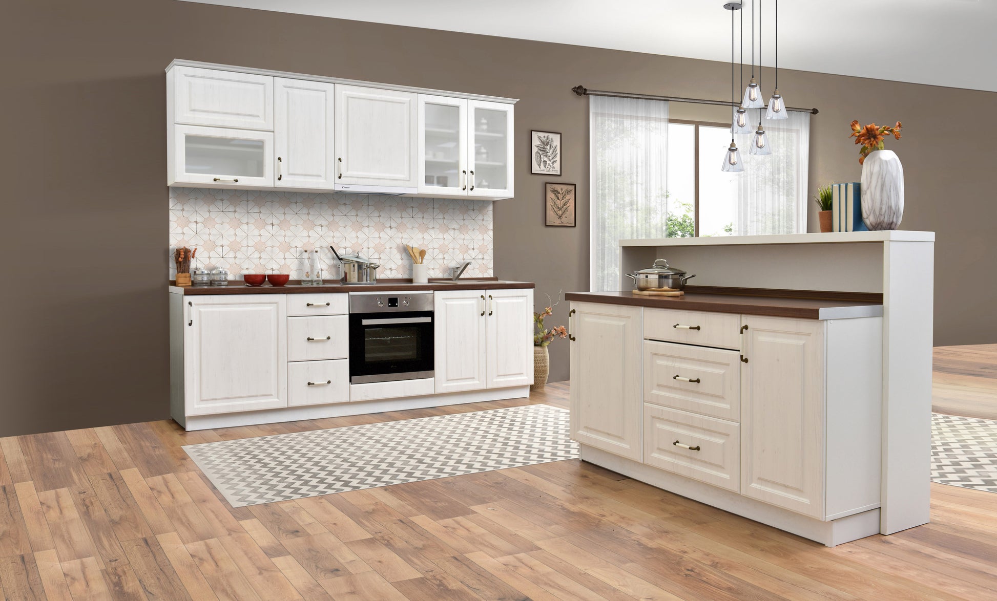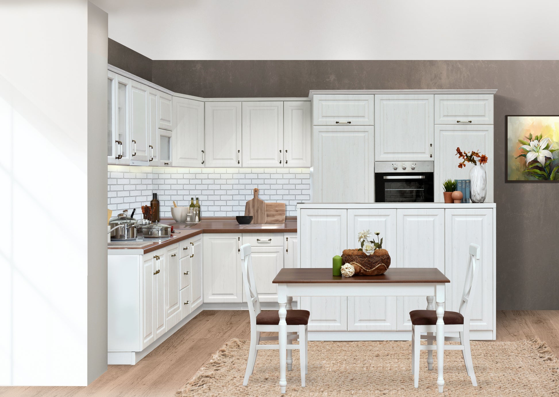 Модулната кухня Rustik в бяло съчетава неподвластна на времето визия с модерна функционалност. Светлите повърхности отразяват светлината и създават усещане за простор, чистота и уют – идеалната база за стилен и подреден дом.